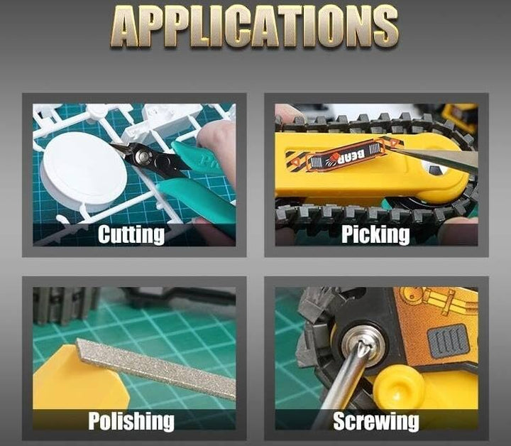 Crafted from professional-grade SK5 steel and fitted with a comfortable TPR anti-slip handle, every tool in the PK-602 kit delivers dependable durability and precise control. The ultra-thin modeler side cutter reaches narrow spaces effortlessly, making it ideal for clean part removal without damaging delicate plastic runners. You also get durable needle files (rough + fine surfaces) for both heavy shaping and smooth finishing, plus a magnetic interchangeable screwdriver with S2 blades for detail assembly work.