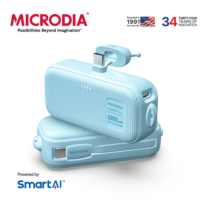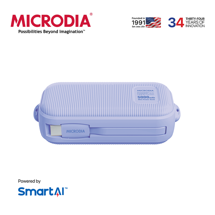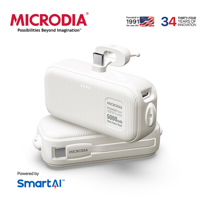 MICRODIA POWERPack™ Nano Traveler 10W Mini Portable Power Bank, 5000mAh with Built-in USB-C Connector + USB-C Cable